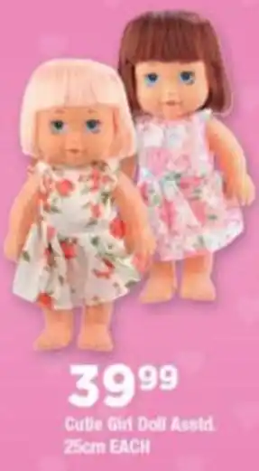 This special is available in various stores, view all products to get the cheapest Cutie Girl Doll. If you'd like to find out whether this product has a bigger discount in another store, check the category 'Grocery stores'. You may also find these specials interesting: Cutie girl doll, Baby cutie doll & BABY CUTIE DOLL.