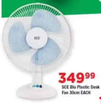 This special is available in various stores, view all products to get the cheapest SCE Blu Plastic Desk Fan. If you'd like to find out whether this product has a bigger discount in another store, check the category 'Grocery stores'. You may also find these specials interesting: AIM 40cm Desk Fan, AIM 30cm Desk Fan & AIM 15cm Rechargeable Desk Fan.