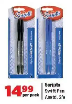 This special is available in various stores, view all products to get the cheapest Scripto Swift Pen. If you'd like to find out whether this product has a bigger discount in another store, check the category 'Grocery stores'. You may also find these specials interesting: Scripto Swift Pen, Scripto Swift Pen Asstd & Scripto Swift Pen Black, Blue Assorted-7s Per Pack.