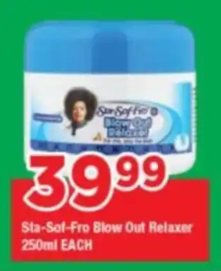 This special is available in various stores, view all products to get the cheapest Sta-Sof-Fro Blow Out Relaxer. If you'd like to find out whether this product has a bigger discount in another store, check the category 'Grocery stores'. You may also find these specials interesting: STA-SOF-FRO Blow Out Relaxer, Sta-Sof-Fro Braid Extra Dry Spray-350ml & Sta-Sof-Fro Extra Dry or Hi-Sheen Braid or Braid Moisturising Spray.