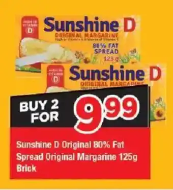This special is available in various stores, view all products to get the cheapest Sunshine D Original 80% Fat Spread Original Margarine Brick. If you'd like to find out whether this product has a bigger discount in another store, check the category 'Grocery stores'. You may also find these specials interesting: SUNSHINE D Original Margarine 80% Fat Spread Brick, SUNSHINE D Original Margarine 80% Fat Spread Brick & SUNSHINE D ORIGINAL MARGARINE 125g.