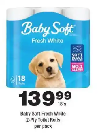 This special is available in various stores, view all products to get the cheapest Baby Soft Fresh White 2-Ply Toilet Rolls. If you'd like to find out whether this product has a bigger discount in another store, check the category 'Grocery stores'. You may also find these specials interesting: Baby soft fresh white 2-ply toilet rolls, Baby Soft Fresh White/ Supreme Quilts 2-Ply Toilet Rolls & Baby Soft 2-Ply Fresh White or Quilts Toilet Rolls Asstd..
