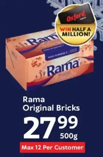 Oxford Freshmarket offers a wide collection of products, besides the Rama Original Bricks. Keep an eye on the weekly Oxford Freshmarket catalogue to find the best specials and promotions. Besides Rama Original Bricks, you can also find the following offers: Rama Margarine Bricks Original, RAMA Brick Original & Rama Original 70% Fat Spread Brick.