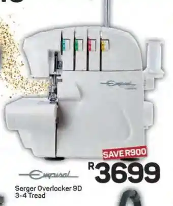 This special is available in various stores, view all products to get the cheapest Empisal Serger Overlocker 9D. If you'd like to find out whether this product has a bigger discount in another store, check the category 'Grocery stores'. You may also find these specials interesting: Empisal Sewing Machine EXP889 10106078, Empisal 43X Sew Machine 889 & Empisal sewing machine.