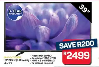 This special is available in various stores, view all products to get the cheapest Maxdorf 39 HD Ready LED TV. If you'd like to find out whether this product has a bigger discount in another store, check the category 'Grocery stores'. You may also find these specials interesting: Hisense HD Ready Digital LED TV 32A3Q, MORA 2K HD Ready Smart LED TV 43D4N & TELEFUNKEN HD Ready LED TV TLEDD-32HDB/E.