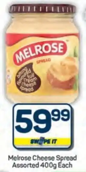 This special is available in various stores, view all products to get the cheapest Melrose Cheese Spread Assorted. If you'd like to find out whether this product has a bigger discount in another store, check the category 'Grocery stores'. You may also find these specials interesting: Melrose Cheese Spread Assorted-400g, Melrose Cheese Spread Assorted-400g Each & Melrose Cheese Spread 400 g Assorted.