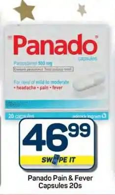 This special is available in various stores, view all products to get the cheapest Panado Pain & Fever Capsules 20s. If you'd like to find out whether this product has a bigger discount in another store, check the category 'Grocery stores'. You may also find these specials interesting: Panado Pain & Fever Capsules 20s, Panado Pain & Fever Capsules & Panado Pain & Fever Tablets.