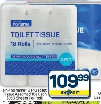 This special is available in various stores, view all products to get the cheapest PnP no name 2 Ply Toilet Tissue. If you'd like to find out whether this product has a bigger discount in another store, check the category 'Grocery stores'. You may also find these specials interesting: PnP no name 2 Ply Toilet Tissue Assorted, PnP no name 2 Ply White Toilet Tissue 18s & PnP no name 2 Ply Toilet Tissue 18s (350 Sheets Per Roll).