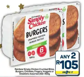 This special is available in various stores, view all products to get the cheapest Rainbow Simply Chicken. If you'd like to find out whether this product has a bigger discount in another store, check the category 'Grocery stores'. You may also find these specials interesting: Rainbow Simply Chicken Bites, RAINBOW Simply Chicken Polony & Rainbow Simply Chicken Polony.