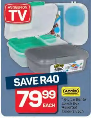 This special is available in various stores, view all products to get the cheapest 1.6 Litre Bento Lunch Box Assorted Colours Each. If you'd like to find out whether this product has a bigger discount in another store, check the category 'Grocery stores'. You may also find these specials interesting: Cube 1.1 Litre Lunch Box Assorted Colours Each, Addis 1.6Ltr Bento Lunch Box Assorted-Each & Addis 770ml Bento Lunch Box 850018236-Each.
