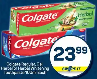 This special is available in various stores, view all products to get the cheapest Colgate Regular, Gel, Herbal or Herbal Whitening Toothpaste. If you'd like to find out whether this product has a bigger discount in another store, check the category 'Grocery stores'. You may also find these specials interesting: Colgate Regular, Gel, Herbal or Herbal Whitening Toothpaste 100ml Each, Colgate Regular/ Gel/ Herbal Toothpaste & COLGATE Regular, Gel, Herbal, Herbal White or Herbal with Salt Toothpaste.