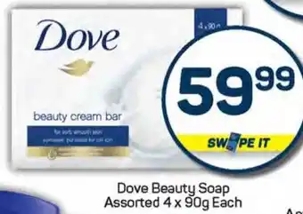 This special is available in various stores, view all products to get the cheapest Dove Beauty Soap Assorted. If you'd like to find out whether this product has a bigger discount in another store, check the category 'Grocery stores'. You may also find these specials interesting: Dove Beauty Soap Assorted 4 x 90g Each, Dove Beauty Soap Assorted 4 x 90g Per Pack & Dove Beauty Soap Asstd..