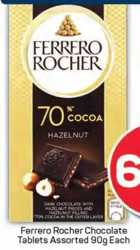 This special is available in various stores, view all products to get the cheapest Ferrero Rocher Chocolate Tablets Assorted. If you'd like to find out whether this product has a bigger discount in another store, check the category 'Grocery stores'. You may also find these specials interesting: Ferrero Rocher Chocolate Tablets Assorted 90g Each, Ferrero Rocher Chocolate & Ferrero Rocher Chocolate.