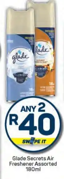 This special is available in various stores, view all products to get the cheapest Glade Secrets Air Freshener Assorted 180ml. If you'd like to find out whether this product has a bigger discount in another store, check the category 'Grocery stores'. You may also find these specials interesting: Glade Secrets Air Freshener Assorted 180ml, Glade Secrets Air Freshener Assorted & Glade Secrets Air Freshener Assorted.