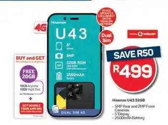 This special is available in various stores, view all products to get the cheapest Hisense U43 32GB. If you'd like to find out whether this product has a bigger discount in another store, check the category 'Grocery stores'. You may also find these specials interesting: Hisense U43, Hisense U43 & Hisense U43 32GB.