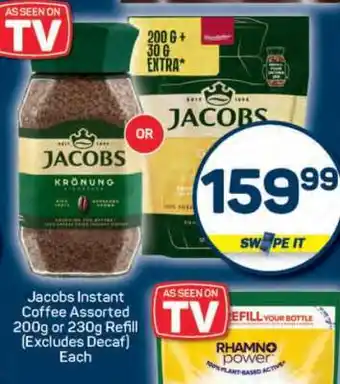 This special is available in various stores, view all products to get the cheapest Jacobs Instant Coffee Assorted 200g or 230g Refill (Excludes Decaf) Each. If you'd like to find out whether this product has a bigger discount in another store, check the category 'Grocery stores'. You may also find these specials interesting: Jacobs Instant Coffee Assorted 200g or 230g Refill (Excludes Decaf) Each, Nescafe Classic Instant Coffee Assorted 200g or 230g Refill & Nescafé Classic Instant Coffee Assorted or Refill.