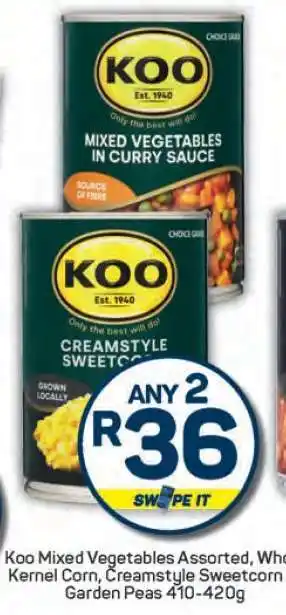 Koo Mixed Vegetables Assorted, Whole Kernel Corn, Creamstyle Sweetcorn, Garden Peas 410-420g promotion at Pick n Pay