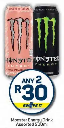 This special is available in various stores, view all products to get the cheapest Monster Energy Drink Assorted. If you'd like to find out whether this product has a bigger discount in another store, check the category 'Grocery stores'. You may also find these specials interesting: Monster Energy Drink Assorted 500ml, Monster Energy Drink Assorted 500ml & MONSTER Energy Drink Assorted.