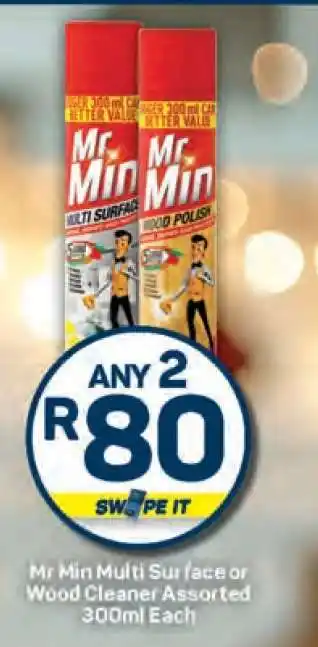 This special is available in various stores, view all products to get the cheapest Mr Min Multi Surface or Wood Cleaner Assorted 300ml Each. If you'd like to find out whether this product has a bigger discount in another store, check the category 'Grocery stores'. You may also find these specials interesting: Mr. Min Multi-Surface Cleaner Assorted, Mr Min Multi-Surface Cleaner & Mr Min Multi Surface Cleaner.