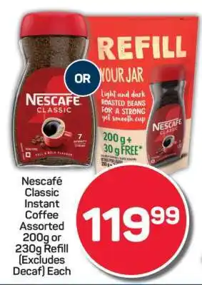 The price of Nescafé Classic Instant Coffee Assorted 200g or 230g Refill (Excludes Decaf) Each can be found at the top of the page, together with the dates during which the special is available. You can also check the price in the current Pick n Pay catalogue or on the Pick n Pay website. Promotional offers assure you of buying Pick n Pay products at the lowest price.