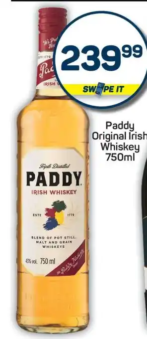 This special is available in various stores, view all products to get the cheapest Paddy Original Irish Whiskey 750ml. If you'd like to find out whether this product has a bigger discount in another store, check the category 'Grocery stores'. You may also find these specials interesting: Paddy Original Irish Whiskey 750ml, Paddy Original Irish Whiskey 750ml & Paddy Irish Whiskey.