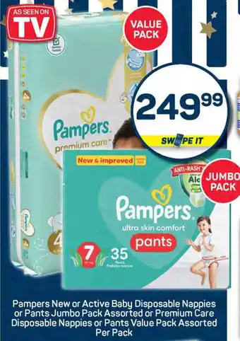 Pampers New or Active Baby Disposable Nappies or Pants Jumbo Pack or Premium Care Disposable Nappies or Pants Value Pack Discount at Pick n Pay