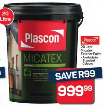 This special is available in various stores, view all products to get the cheapest Plascon Micatex Exterior Paint. If you'd like to find out whether this product has a bigger discount in another store, check the category 'Grocery stores'. You may also find these specials interesting: Plascon Micatex Exterior Paint, Plascon 20L Micatex (26571) & Plascon 20L Micatex (705421).