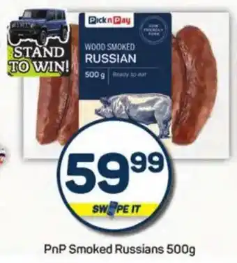 The price of PnP Smoked Russians can be found at the top of the page, together with the dates during which the special is available. You can also check the price in the current Pick n Pay catalogue or on the Pick n Pay website. Promotional offers assure you of buying Pick n Pay products at the lowest price.