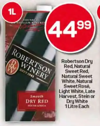 Robertson Dry Red, Natural Sweet Red, Natural Sweet White, Natural Sweet Rosé, Light White, Late Harvest, Stein or Dry White Discount at Pick n Pay