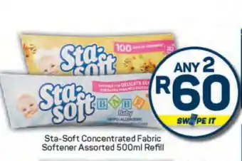 This special is available in various stores, view all products to get the cheapest Sta-Soft Concentrated Fabric Softener Assorted 500ml Refill. If you'd like to find out whether this product has a bigger discount in another store, check the category 'Grocery stores'. You may also find these specials interesting: Sta-Soft Concentrated Fabric Softener Assorted, Sta-Soft Fabric Softener Refill Assorted & STA-SOFT Fabric Softener Refill.