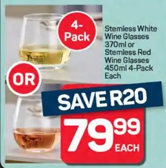 Stemless White Pack Wine Glasses or Stemless Red Wine Glasses promotion at Pick n Pay