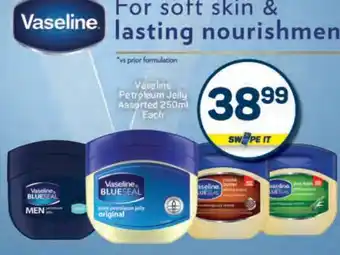 The price of Vaseline Petroleum Jelly Assorted 250ml Each can be found at the top of the page, together with the dates during which the special is available. You can also check the price in the current Pick n Pay catalogue or on the Pick n Pay website. Promotional offers assure you of buying Pick n Pay products at the lowest price.