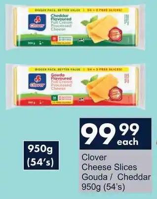 This special is available in various stores, view all products to get the cheapest Clover Cheese Slices Gouda/ Cheddar. If you'd like to find out whether this product has a bigger discount in another store, check the category 'Grocery stores'. You may also find these specials interesting: Clover Cheddar or Gouda Processed Cheese Slices 950 g, Clover Cheddar/ Gouda Full Cream Processed Cheese Slices & Parmalat Gouda or Cheddar Cheese.