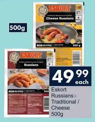 This special is available in various stores, view all products to get the cheapest Eskort Russians Traditional/ Cheese. If you'd like to find out whether this product has a bigger discount in another store, check the category 'Grocery stores'. You may also find these specials interesting: Eskort Smoked Russians, Thompsons Chicken/ Cheese Russians & RAINBOW SMOKED RUSSIANS.