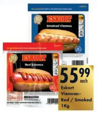 This special is available in various stores, view all products to get the cheapest Eskort Viennas Red/ Smoked. If you'd like to find out whether this product has a bigger discount in another store, check the category 'Grocery stores'. You may also find these specials interesting: Eskort Red or Smoked Viennas, Eskort Viennas + Eskort French/ Garlic & Oxford Viennas Chicken/ Smoked.