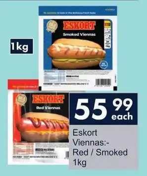 This special is available in various stores, view all products to get the cheapest Eskort Viennas Red/ Smoked. If you'd like to find out whether this product has a bigger discount in another store, check the category 'Grocery stores'. You may also find these specials interesting: Eskort Smoked/ Red Viennas, Eskort Red or Smoked Viennas & Eskort Red or Smoked Viennas.