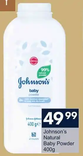 This special is available in various stores, view all products to get the cheapest Johnson's Natural Baby Powder. If you'd like to find out whether this product has a bigger discount in another store, check the category 'Grocery stores'. You may also find these specials interesting: Johnson's Natural Baby Powder, Johnson's Baby Natural Powder-400g & Johnson's Baby Wipes.