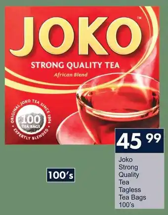 This special is available in various stores, view all products to get the cheapest Joko Strong Quality Tea Tagless Tea Bags. If you'd like to find out whether this product has a bigger discount in another store, check the category 'Grocery stores'. You may also find these specials interesting: Joko Strong Quality Tea Bags, Joko Tagless Tea Bags & TRINCO STRONG QUALITY TEA BAGS.
