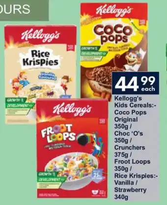 This Kellogg's Kids Cereals Coco Pops Original/ Choc 'O's/ Crunchers/ Froot Loops/ Rice Krispies Vanilla/ Strawberry is available in the following branches based on your set location:
