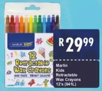 This special is available in various stores, view all products to get the cheapest Marlin Kids Retractable Wax Crayons. If you'd like to find out whether this product has a bigger discount in another store, check the category 'Grocery stores'. You may also find these specials interesting: Marlin Kids Retractable Wax Crayons, Marlin Kids Retractable Crayons & Marlin kids retractable crayons.