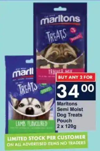 This special is available in various stores, view all products to get the cheapest Marltons Semi Moist Dog Treats Pouch. If you'd like to find out whether this product has a bigger discount in another store, check the category 'Grocery stores'. You may also find these specials interesting: Marltons Semi Moist Treats, Marltons Moist Dog Treats Asstd. & Marltons Dog Treats Asstd. Tub.