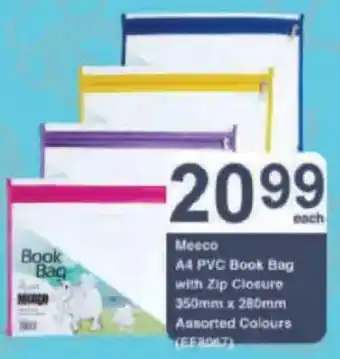This special is available in various stores, view all products to get the cheapest Meeco A4 PVC Book Bag with Zip Closure. If you'd like to find out whether this product has a bigger discount in another store, check the category 'Grocery stores'. You may also find these specials interesting: Meeco A4 Nylon Book Bag with Zip Closure, Croxley PVC Book Bag Clear A4 & Scripto A4 Zip Book Bag Assorted-Each.