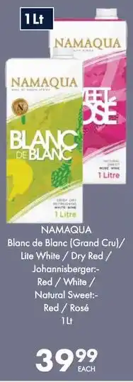 Namaqua Blanc de Blanc Grand Cru/ Lite White/ Dry Red/ Johannisberger Red/ White/ Natural Sweet Red/ Rosé offers and online specials, directly from President Hyper
