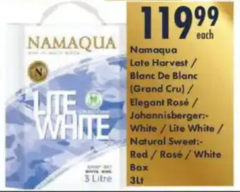 Namaqua Late Harvest/ Blanc De Blanc/ Elegant Rosé/ Johannisberger White/ Lite White/ Natural Sweet Red/ Rosé/ White Box 3 Lt