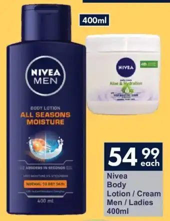 This special is available in various stores, view all products to get the cheapest Nivea Body Lotion/ Cream Men/ Ladies. If you'd like to find out whether this product has a bigger discount in another store, check the category 'Grocery stores'. You may also find these specials interesting: Nivea Ladies Body Lotion Or Cream-For 2 x 400ml, Nivea Men Body Lotion Or Cream-For 2 x 400ml & NIVEA Body Lotion or Cream.