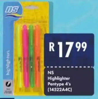 This special is available in various stores, view all products to get the cheapest NS Highlighter Pentype. If you'd like to find out whether this product has a bigger discount in another store, check the category 'Grocery stores'. You may also find these specials interesting: NS Whiteboard Markers, NS Adhesive Tape & Duram NS1 Rustbuster.