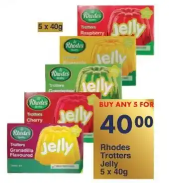 This special is available in various stores, view all products to get the cheapest Rhodes Trotters Jelly. If you'd like to find out whether this product has a bigger discount in another store, check the category 'Grocery stores'. You may also find these specials interesting: Rhodes Trotters Jelly, Rhodes Trotters Jelly Assorted & Rhodes Trotters Jelly 40 g Assorted.