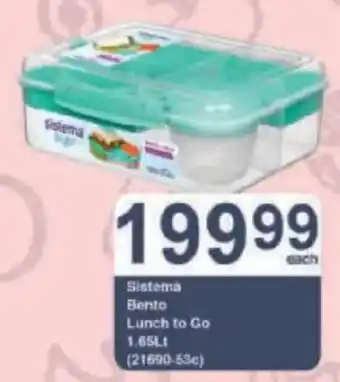 This special is available in various stores, view all products to get the cheapest Sistema Bento Lunch to Go. If you'd like to find out whether this product has a bigger discount in another store, check the category 'Grocery stores'. You may also find these specials interesting: Sistema Lunch Box Bento/ To Go, Lunch Box Bento To Go & Sistema Bento Cube.