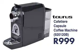 This special is available in various stores, view all products to get the cheapest Taurus Cafetiere Capsule Coffee Machine. If you'd like to find out whether this product has a bigger discount in another store, check the category 'Grocery stores'. You may also find these specials interesting: Taurus Cafetiere Capsule/ Pods Coffee Machine 1400W, Taurus Cuina Mestre Kitchen Machine 1000W & Taurus Digitalbrew Master Expresso Coffee Maker.