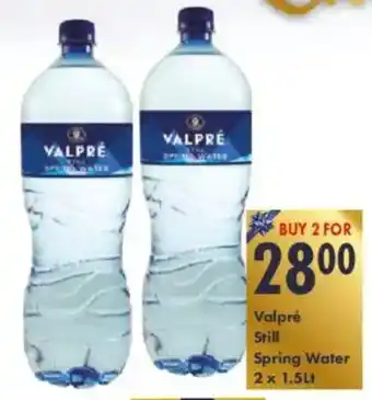 This special is available in various stores, view all products to get the cheapest Valpré Still Spring Water. If you'd like to find out whether this product has a bigger discount in another store, check the category 'Grocery stores'. You may also find these specials interesting: Valpré Still or Sparkling Spring Water, Valpré Still or Sparkling Spring Water & Valprè Still or Sparkling Spring Water 6 x 500ml Per Pack.